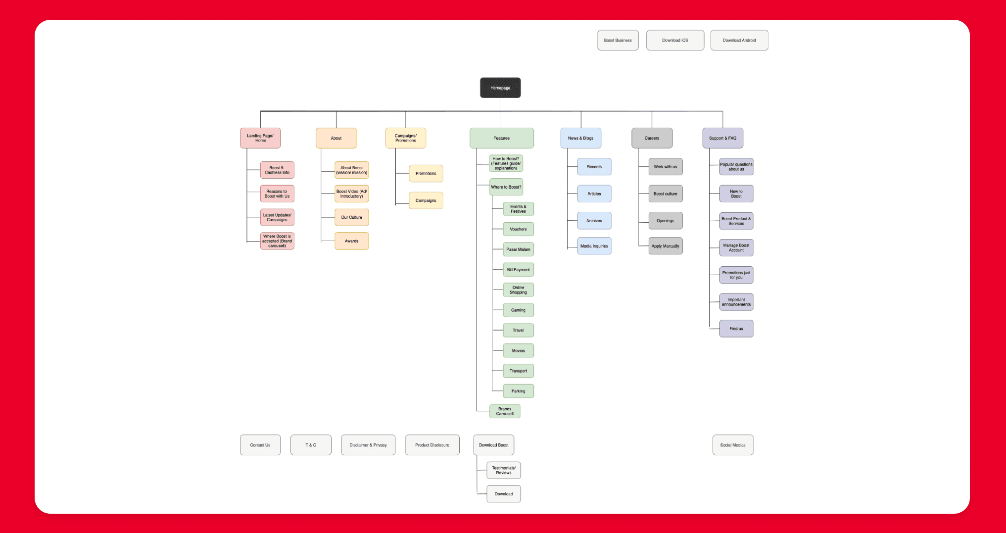 Redesign the Boost E-wallet website to streamline information and navigation, ensuring users quickly access relevant content. This aims to enhance user experience, promote key features, and drive conversions, balancing user needs and business goals. The objective is to increase website traffic, extend browsing sessions, and improve user satisfaction.