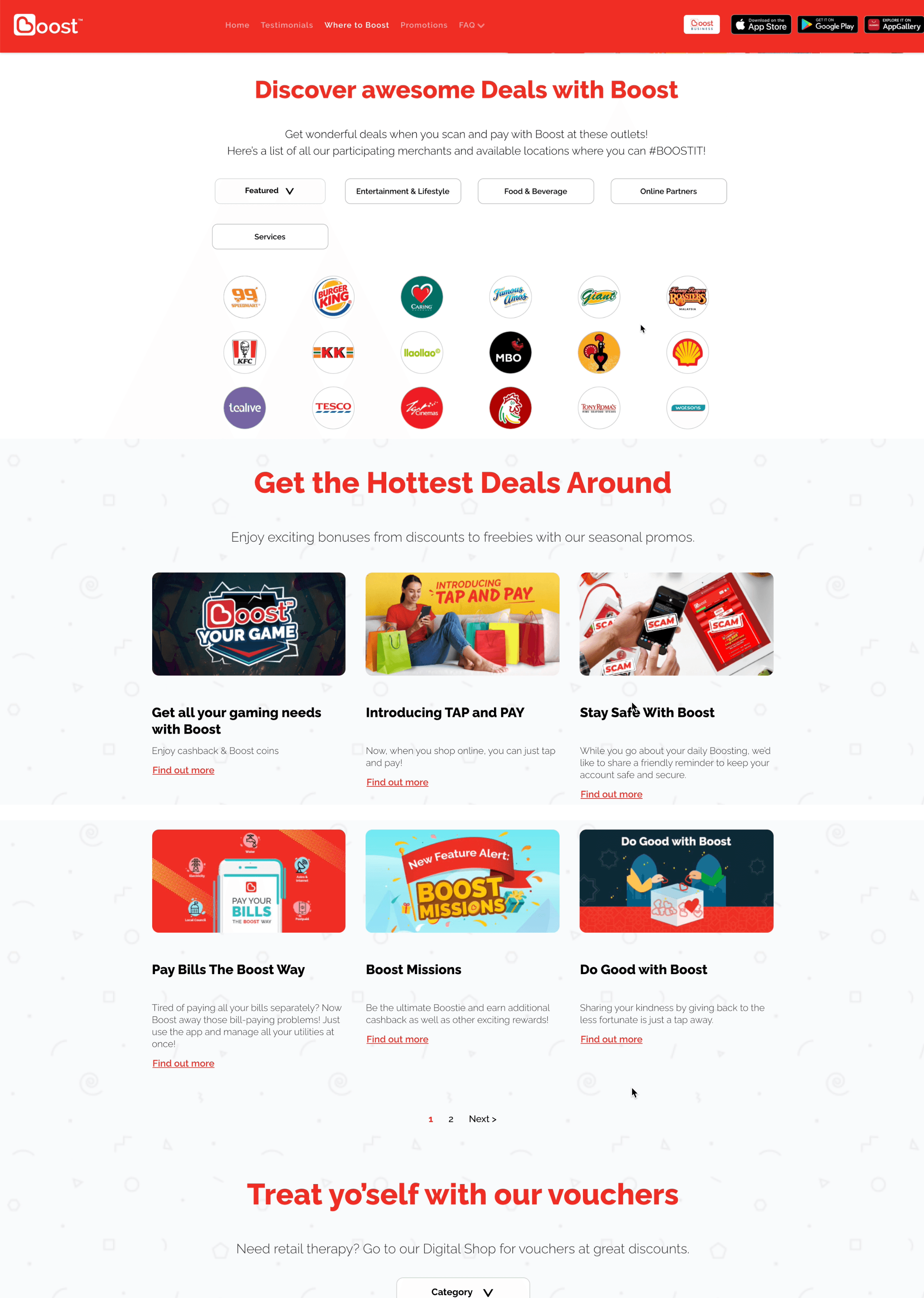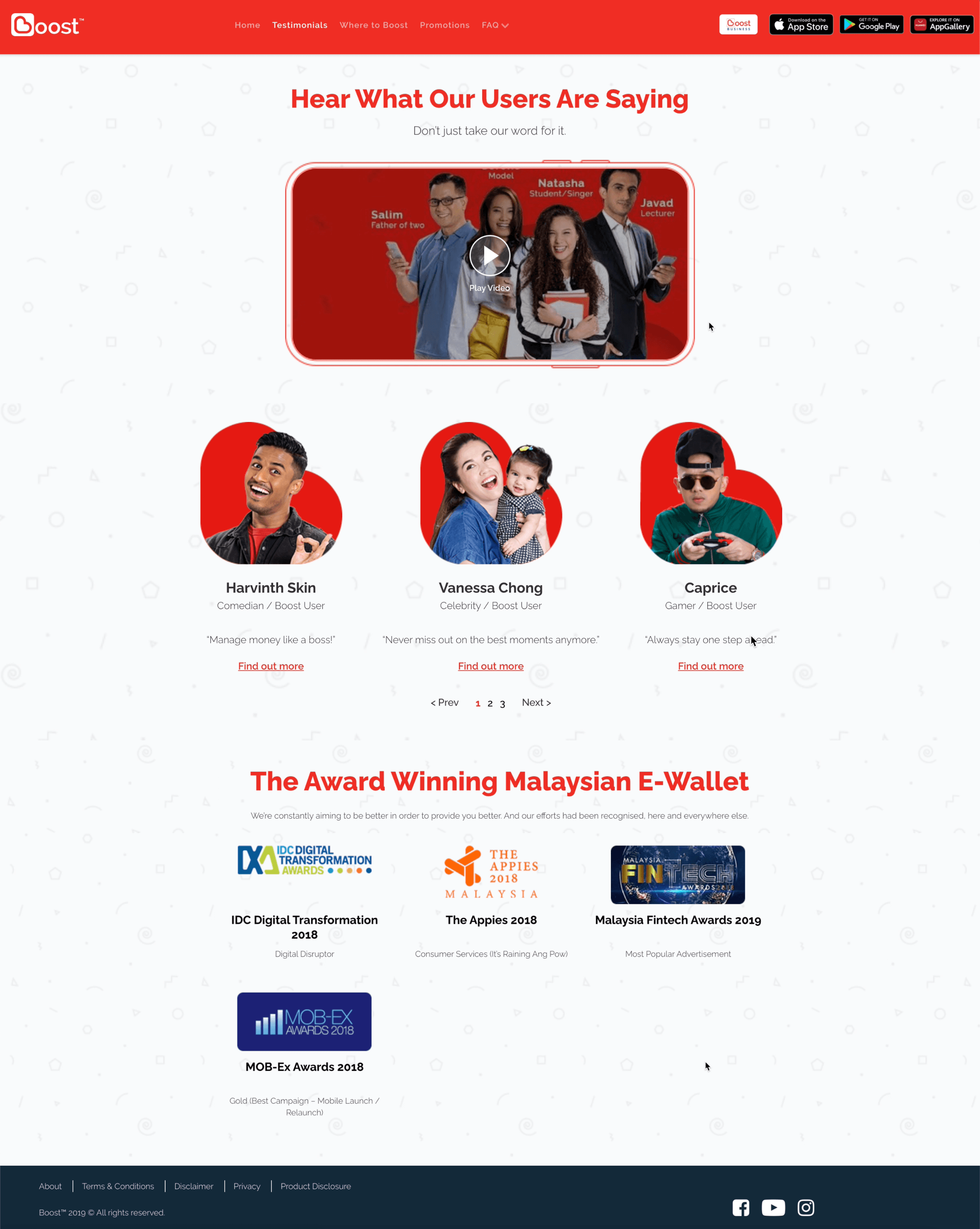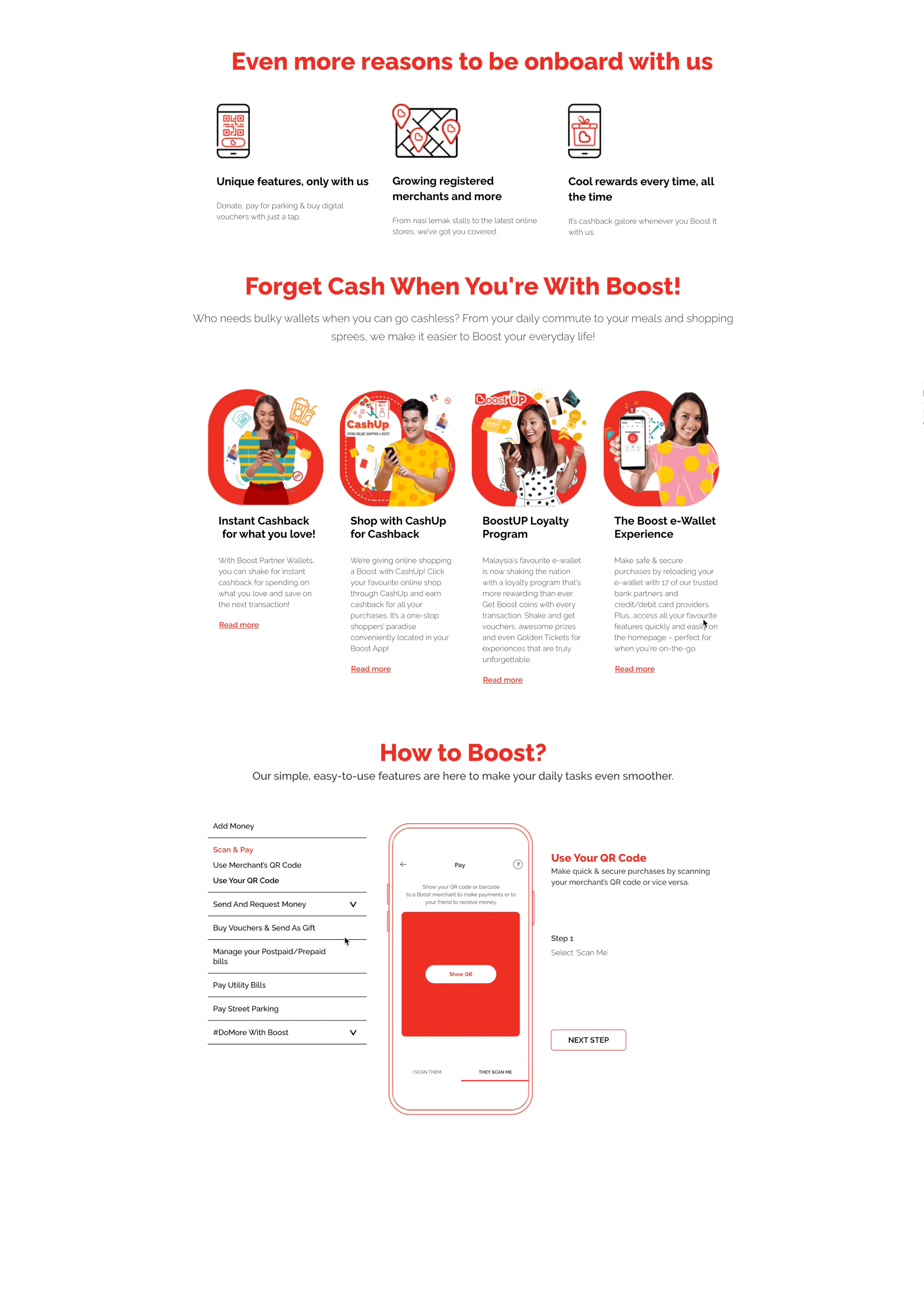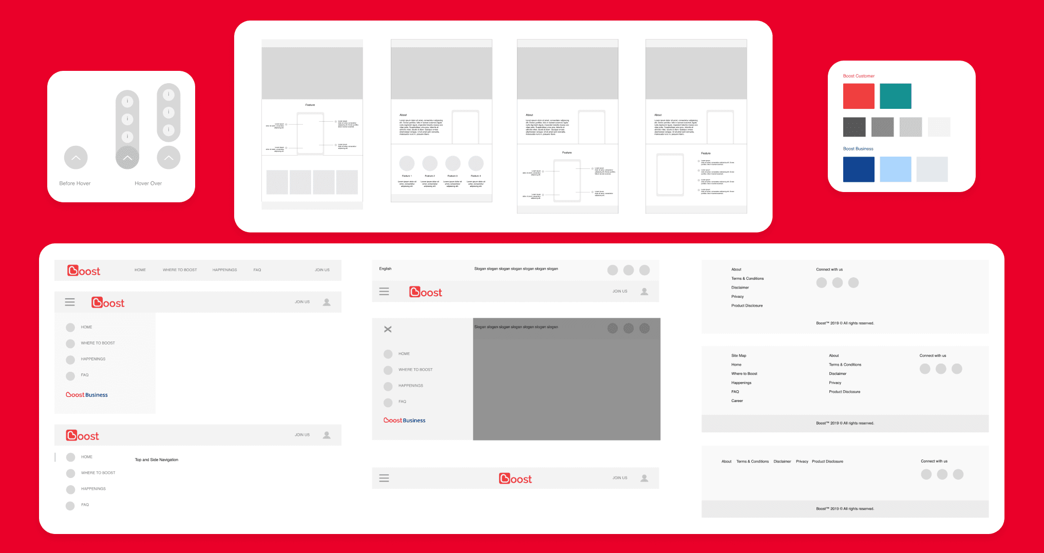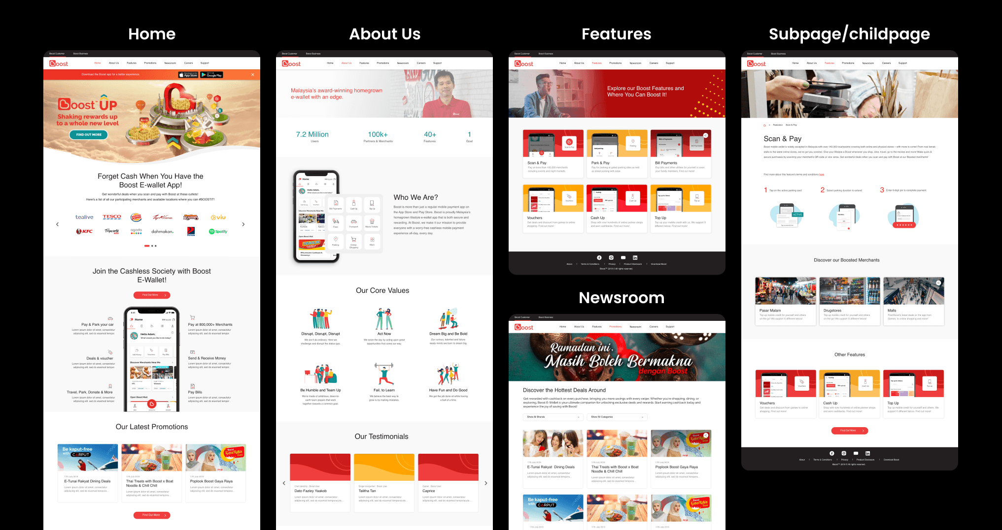 I worked on all the pages for Boost website for consumer and merchant (not shown in this case study), which includes the Home, About Us, Promotions, Features, Newsroom, Careers, Support and Footer section which includes About, Terms & Conditions, Privacy, Product Disclosure, Download Boost.