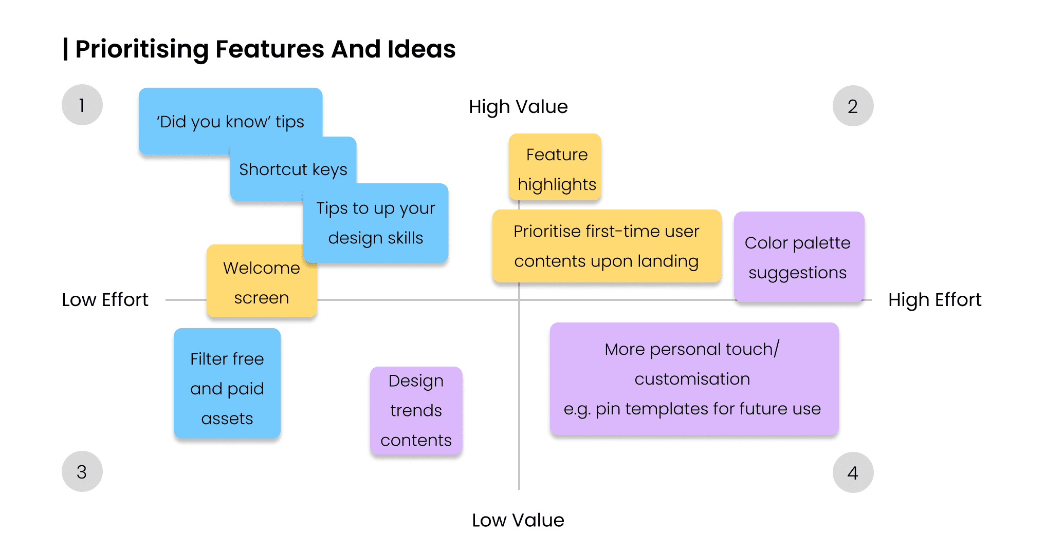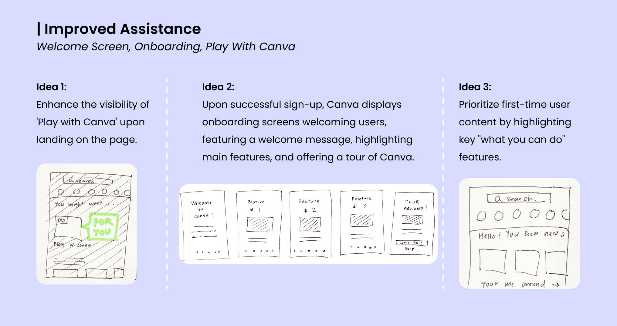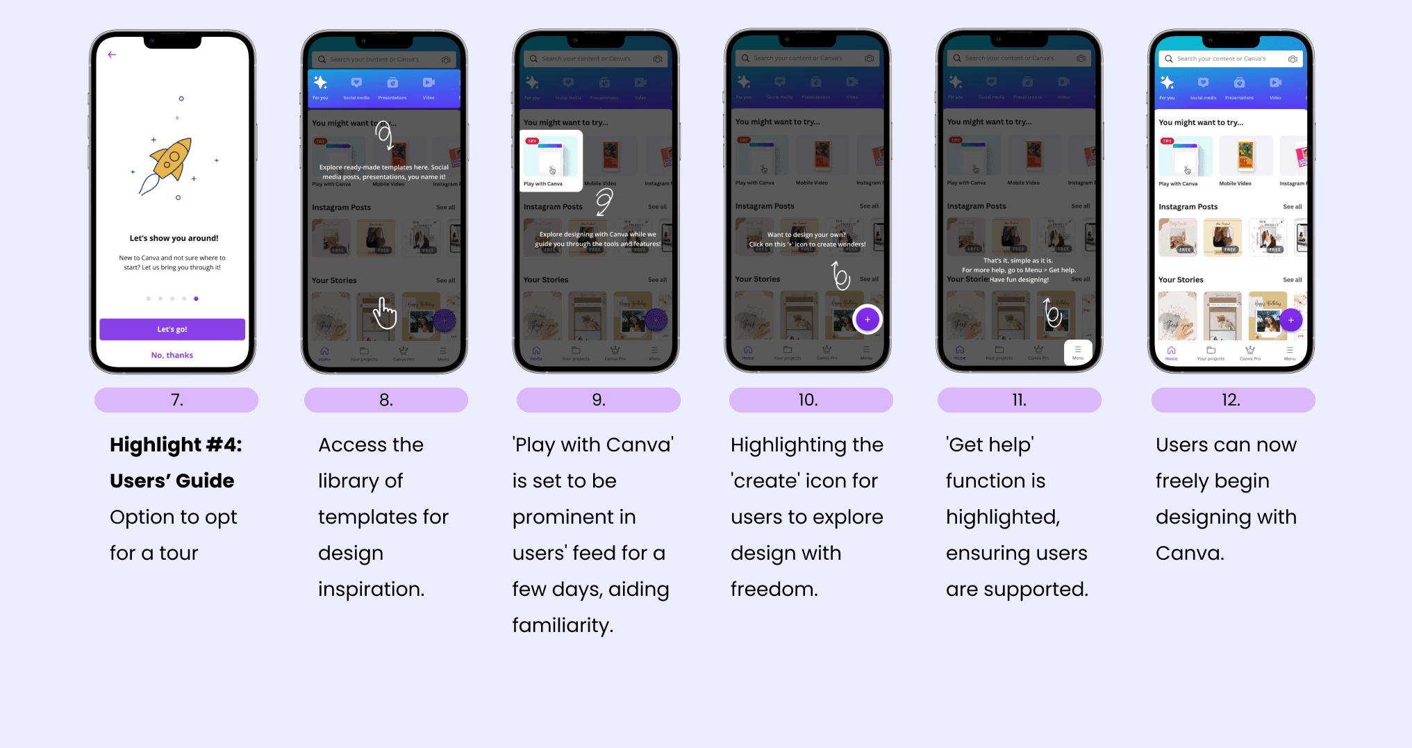 Insight: Although there is a guide on how to use Canva using the 'Play with Canva' feature, many users did not seem to acknowledge its existence when newly onboarded. From the survey, quite a few users mentioned that some guidance on how to use Canva would be useful during their onboarding journey.