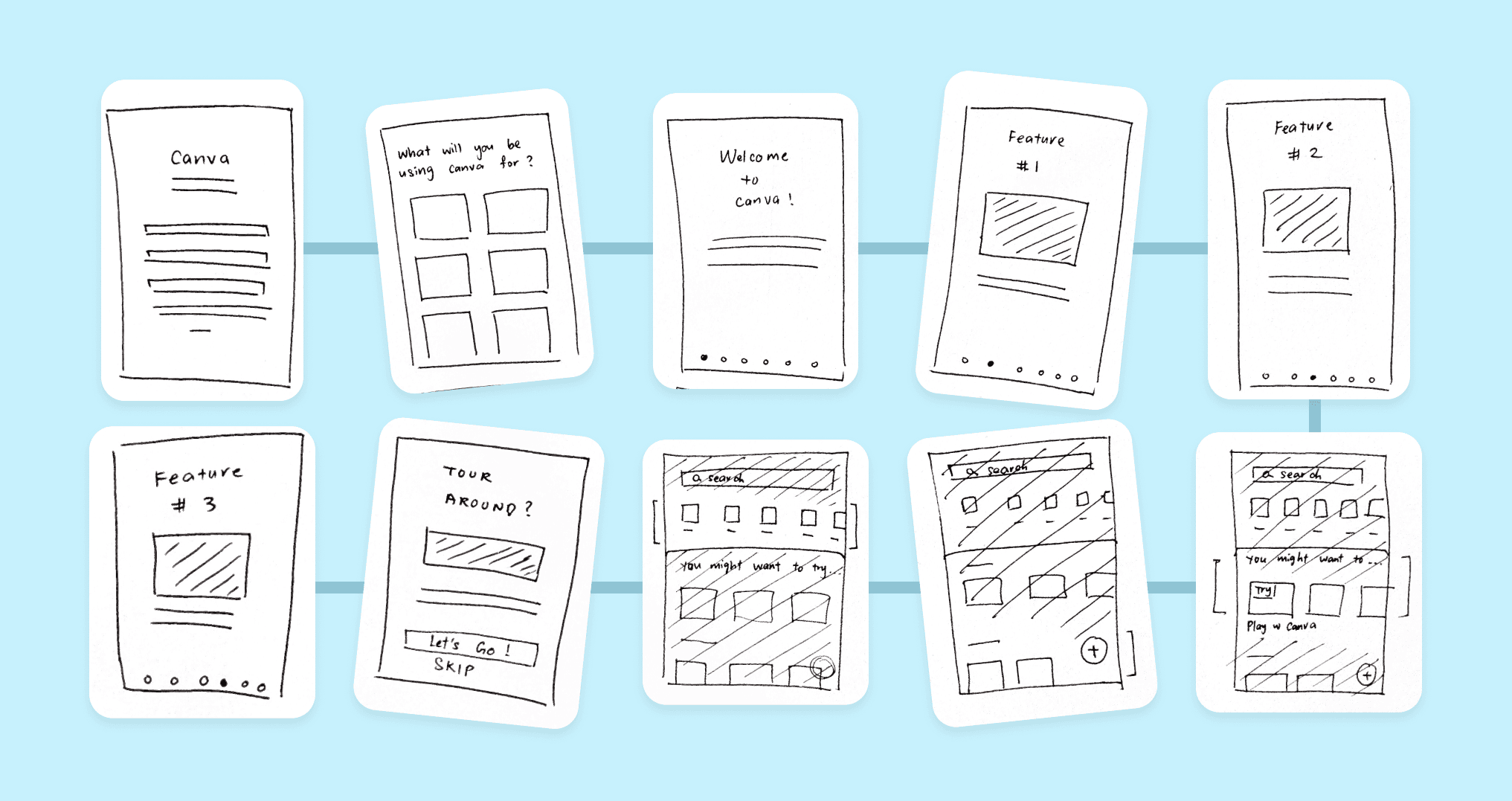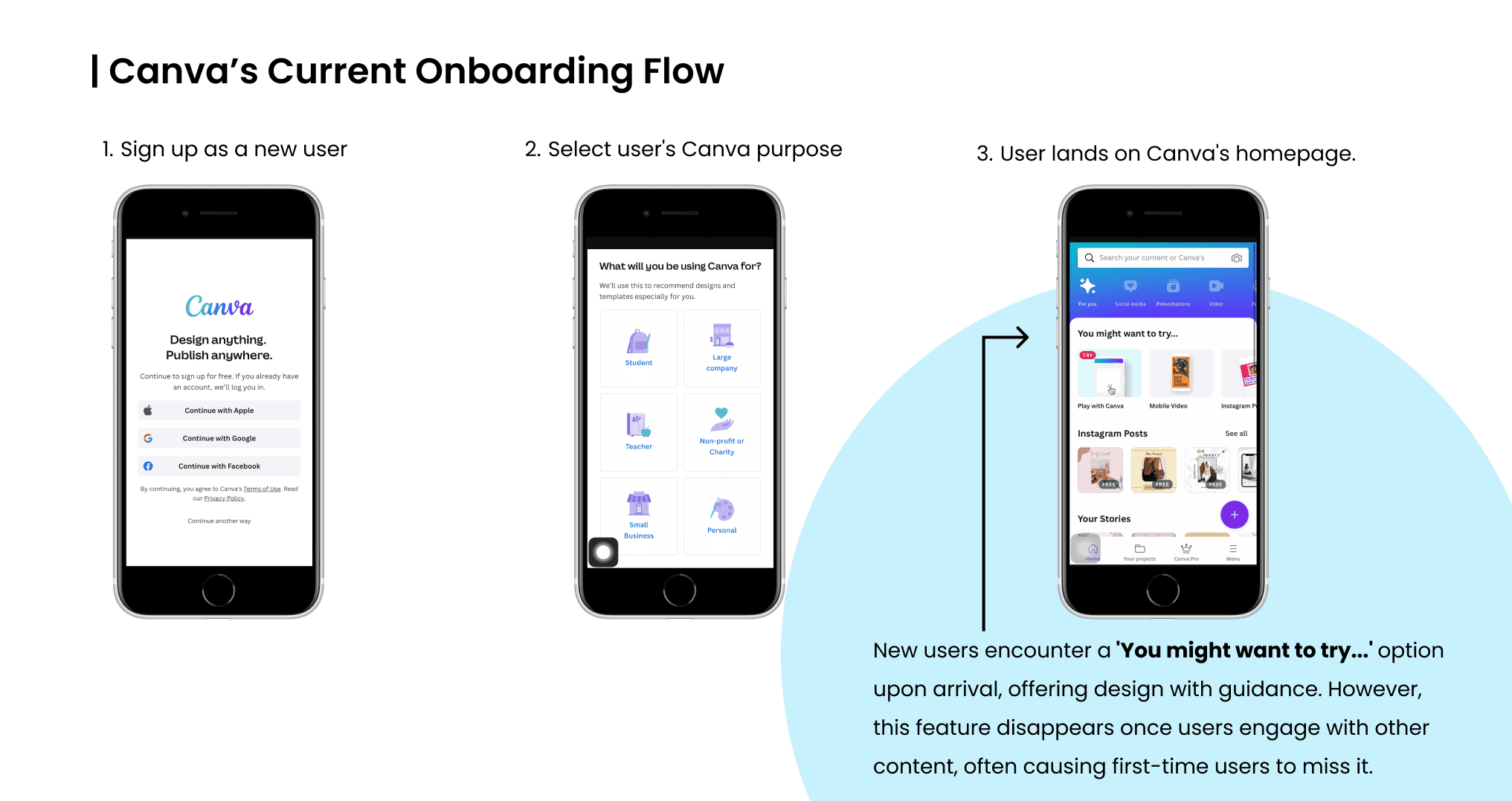 Exploring the app I'm developing: The reference below is the sign-up journey as a new user in the Canva app. The app’s onboarding flow is pretty straightforward. However, I've noticed in when landing on the main feed, the 'You might want to try' feature is easily missed.