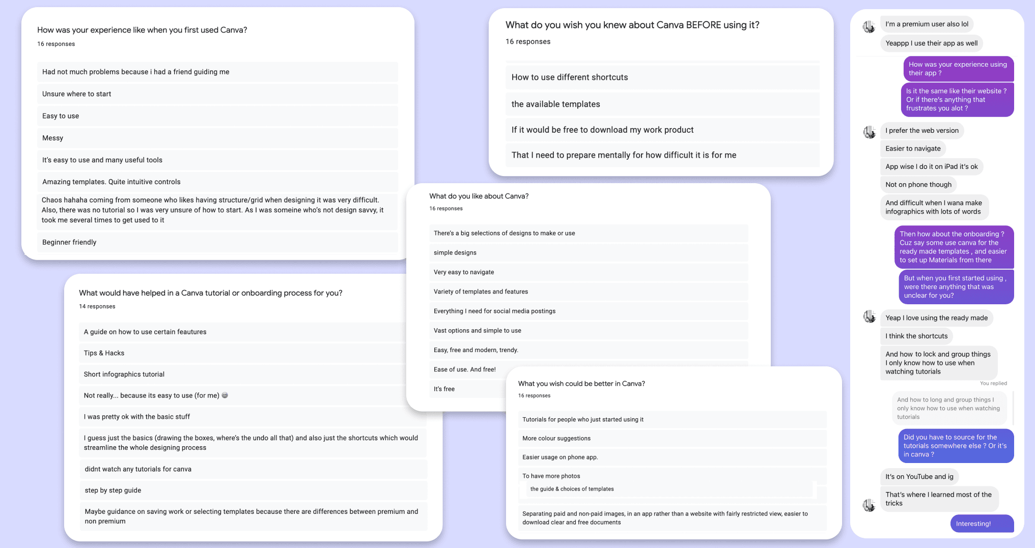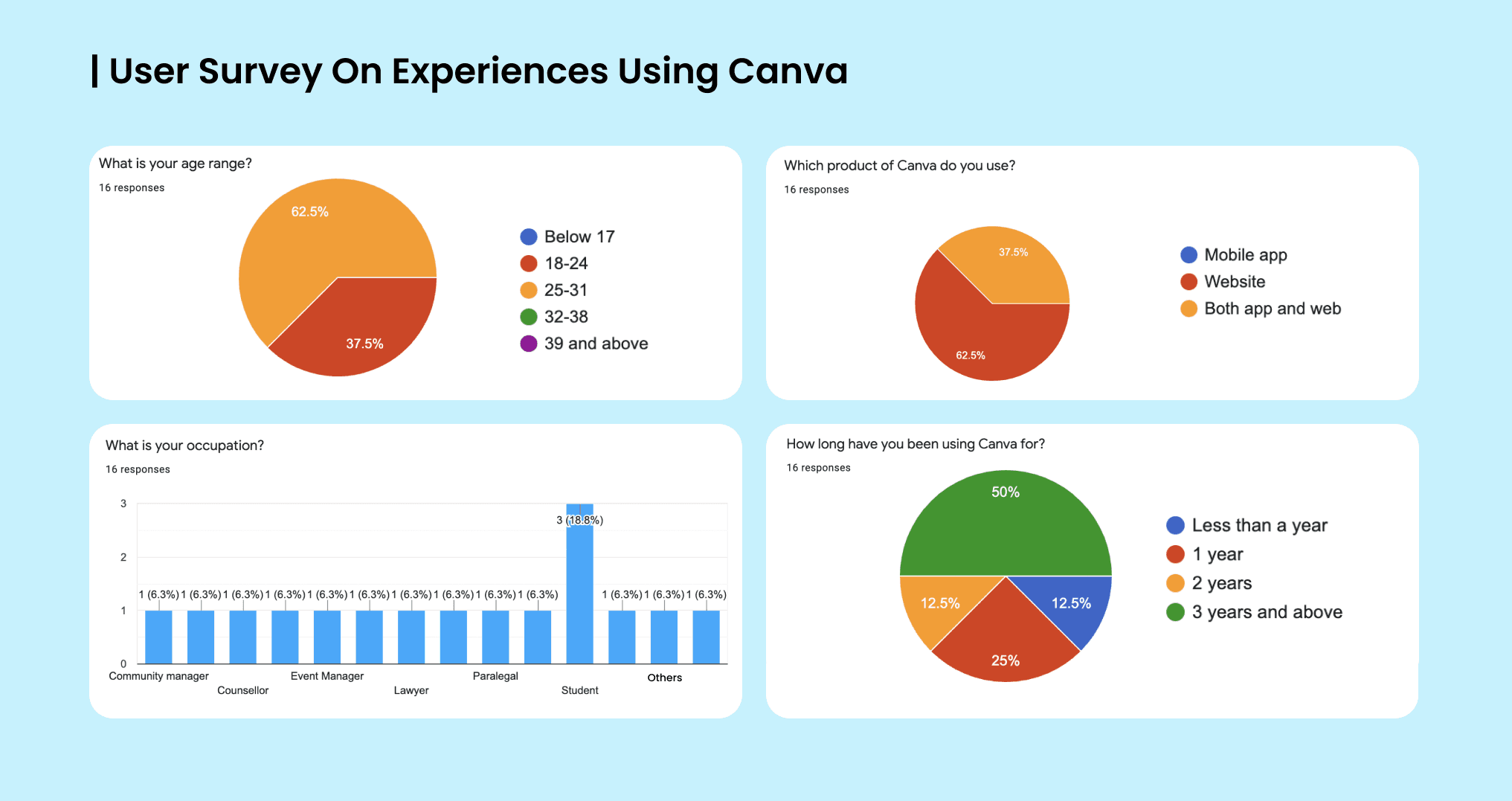 After reviewing app store feedback, I noticed that many comments didn't address users' initial experiences. Wanting to delve deeper into users' journeys and perceptions of Canva, I conducted a user survey, which garnered responses from 16 Canva users.