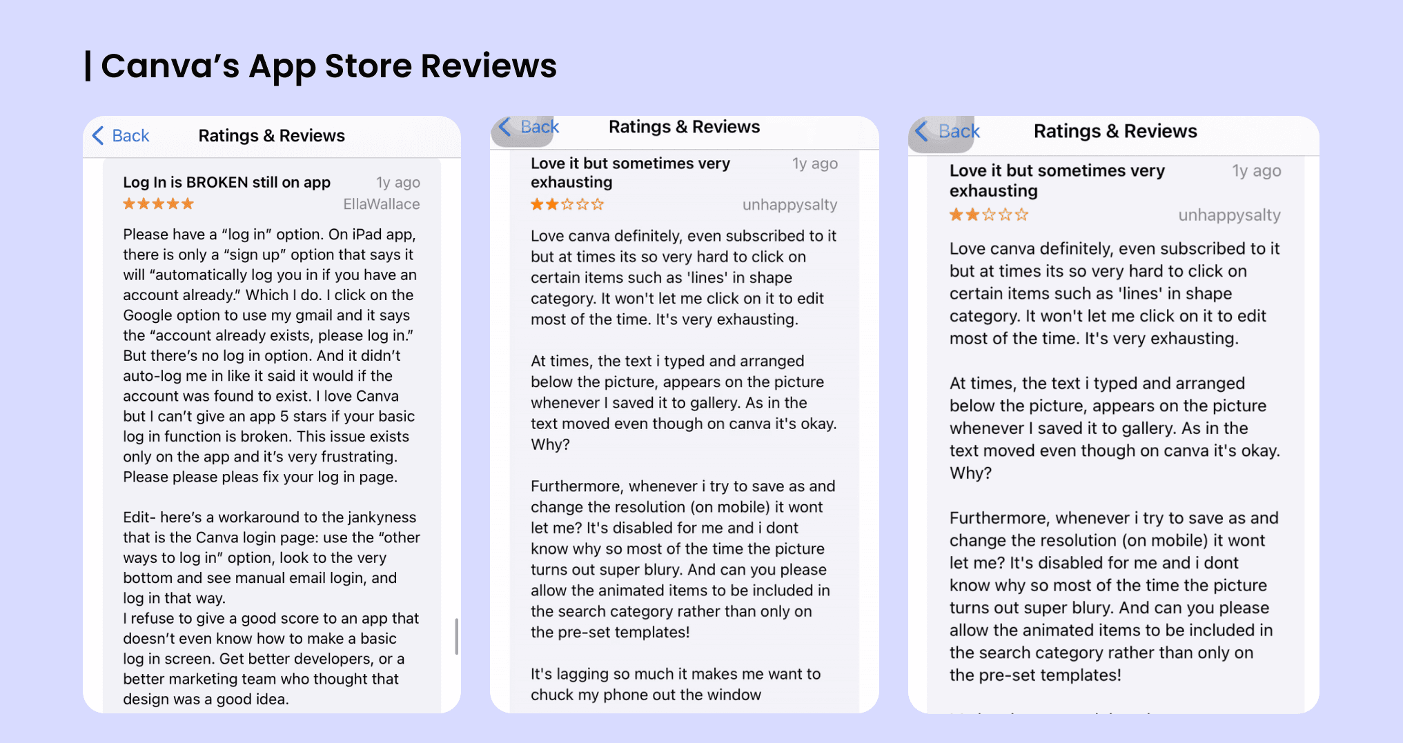I analysed app store reviews to understand current user pain points and needs, aiming to gauge sentiments and identify specific areas of struggle within the Canva app.