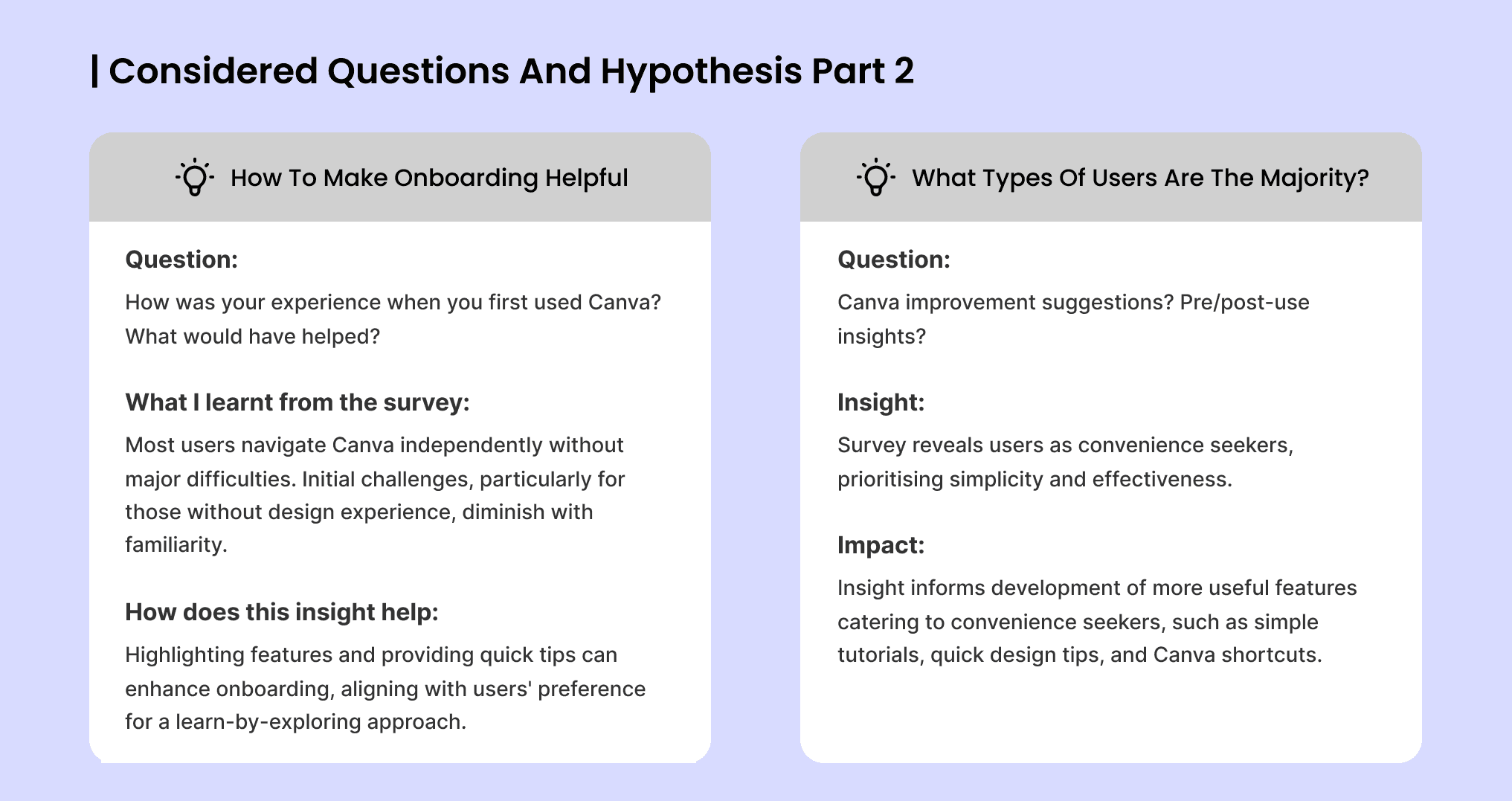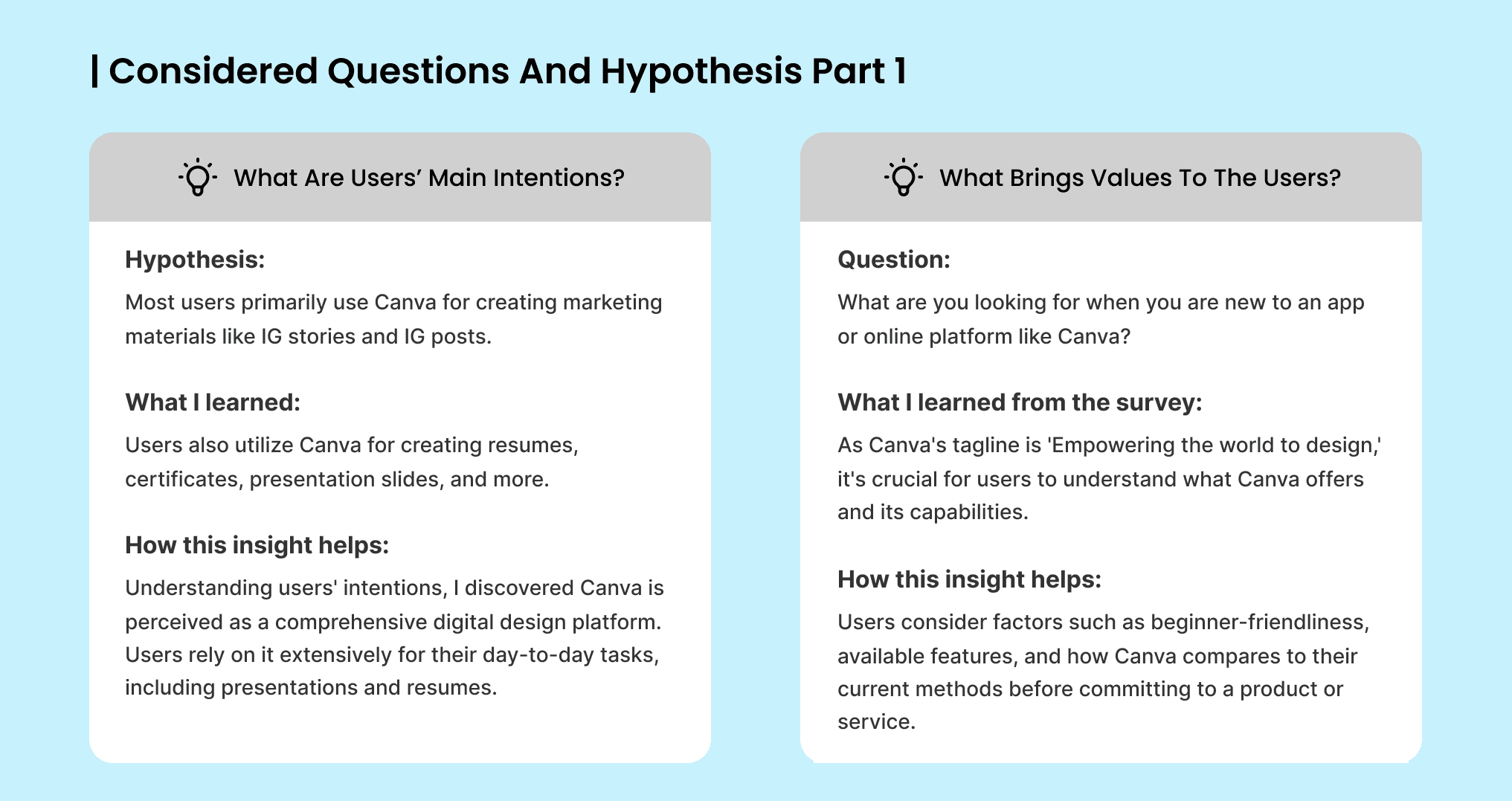 Based on the survey findings I synthesized, I began segmenting my thoughts and insights into questions that delve deeper. For example, what are the main purposes of users using Canva? What do users need to familiarize themselves with on a new platform like Canva?