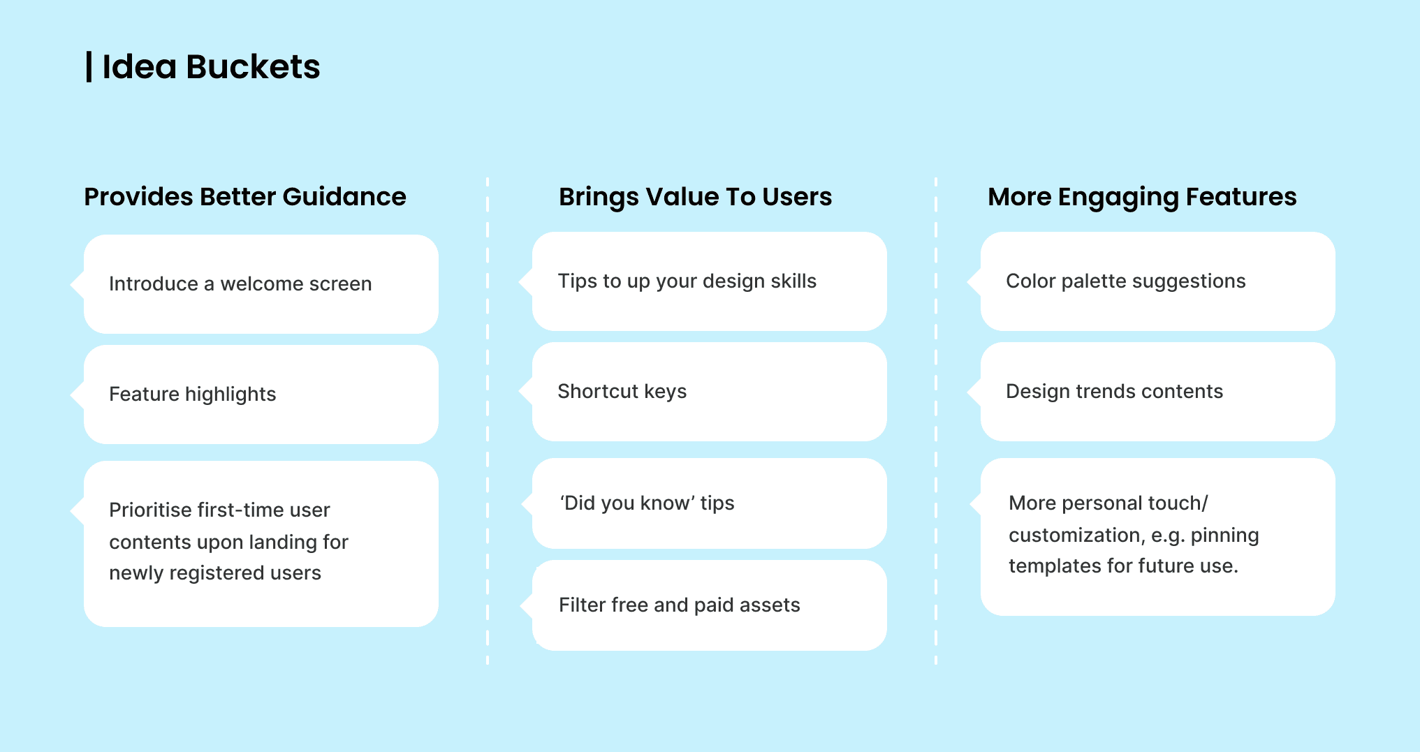 Based on the responses, users' needs were categorised into three main buckets: better guidance, valuable features, and enhanced engagement. These elements are crucial for improving overall user experience, sign-ups, and retention.