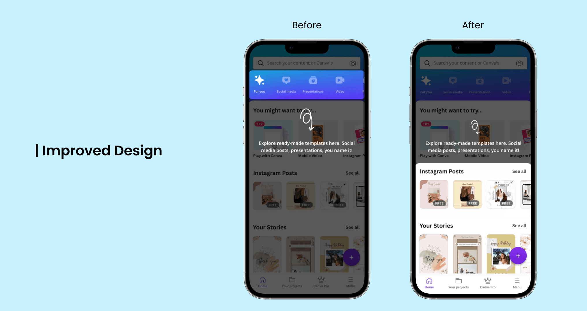 After improvement: Users quickly noticed highlighted features and began designing, making it faster to familiarise themselves with the templates available in Canva.