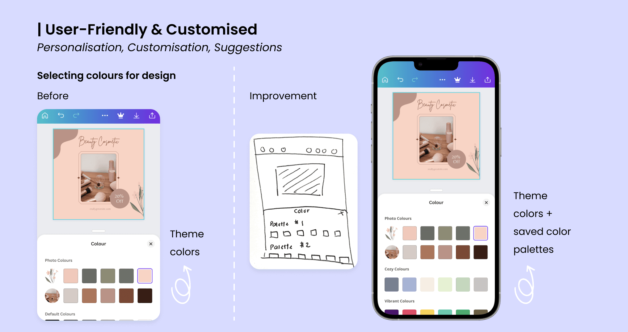 Current State: In Canva, colour suggestions are selected based on the image or theme set in the chosen template. When a user chooses another colour, they must pair it with a complementary colour themselves. This process can be time-consuming and stressful, especially for users with limited design experience.