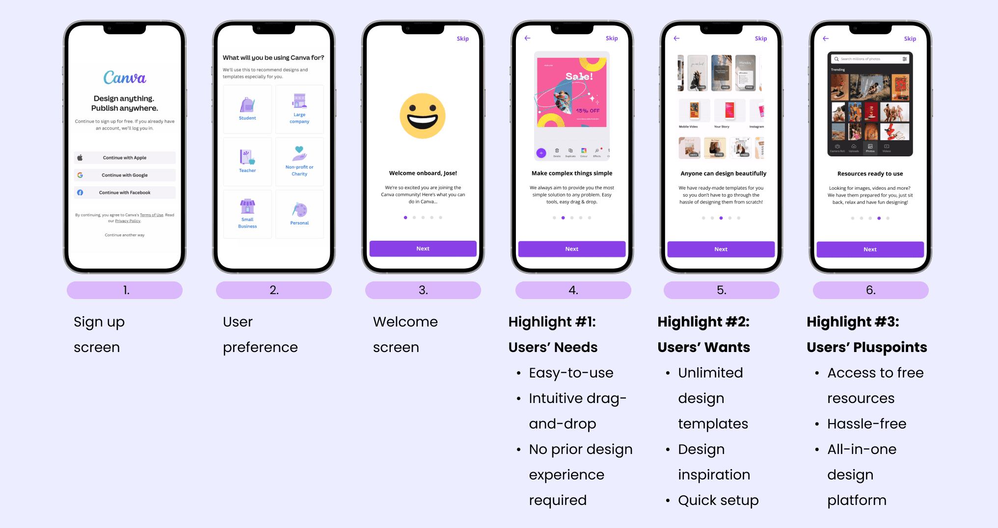 User Needs (screen 4): Recognising the prevalent convenience-seeking behaviour among users, the onboarding journey now prominently showcases quick access to templates and efficient design creation tools, enhancing ease of use and productivity.